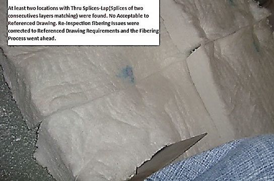 Findings: Observed at least two locations with Thru Splices-Lap (Splices of two consecutives fibering layers matching), Not Acceptable to Referenced Customer Specification Section 6.0.