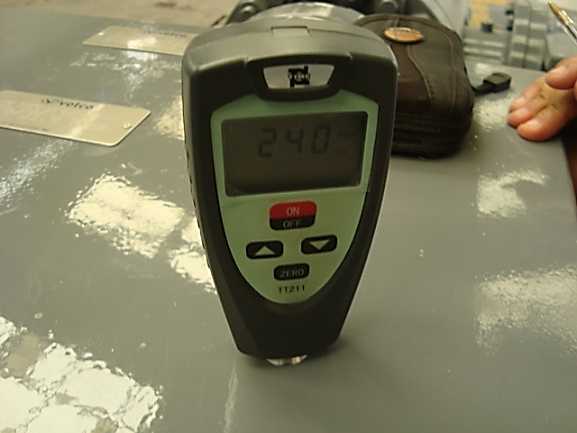 Findings: Carbon Steel Pump Parts and Top Surface of Base Plate. Specified Total DFT Range per Vendor Paint Spec above: 8.0 to 12.0 Mils: Actual DFT Measurements: 11.5, 13.8, 14.5, 16.3 and 15.7 Mils Total Average-14.3 mils. Out of Tolerance to Customer Specification-SERJ-I-003 Rev 2 and SSPC-PA-2 Standard.